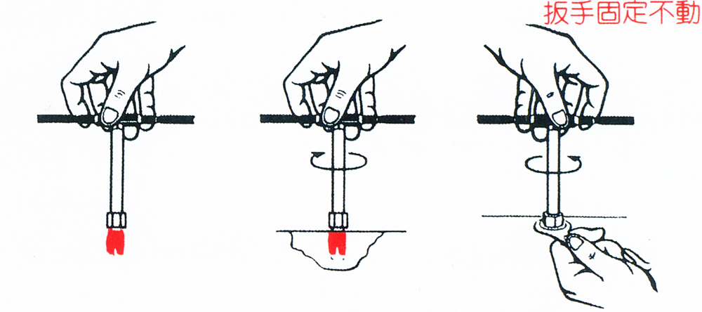 先用螺帽將螺套固定住再旋入下穴,裝妥後將螺栓固定,旋開螺帽,即可將螺栓順利取出。