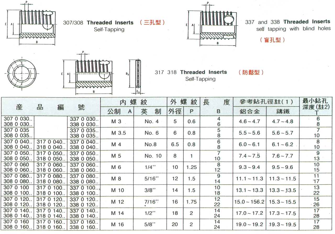 以上鈷孔徑值僅供作參考用,使用者應根據實際試裝經驗得到最佳工作效率及締結強度、最重要的是在每鉆第一孔時一定要用適當量規去檢查實鉆孔徑是否正確。